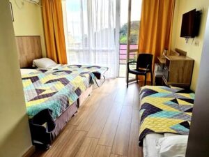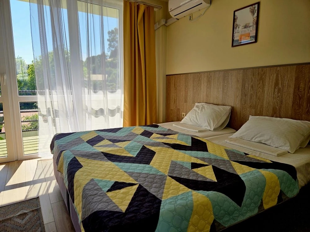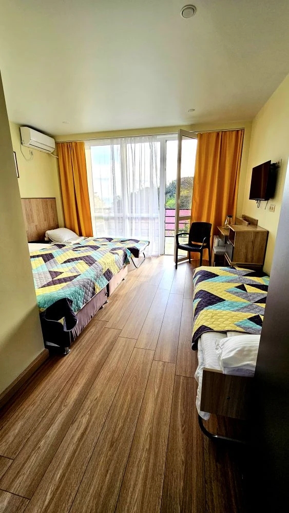 - 2-3-4-х местный стандарт. Количество основных мест: 2-3-4. Количество допмест: 1. В номере: душ, туалет, фен, ТВ, холодильник, кондиционер, Wi-Fi, двуспальная или две раздельные кровати, балкон.