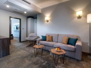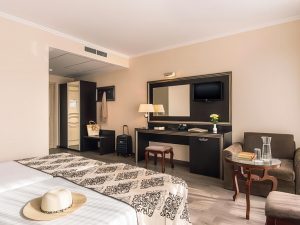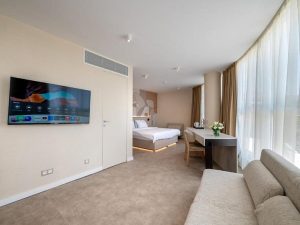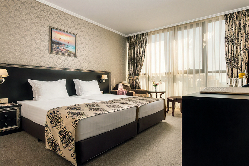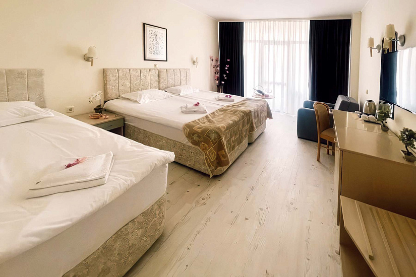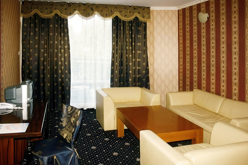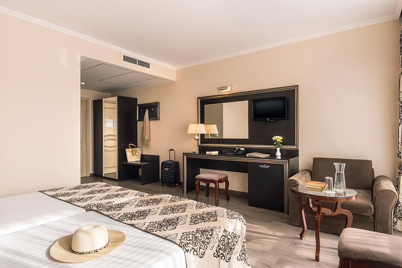 - JUNIOR SUITE ~30 кв.м: 2 односпальные кровати + 2 доп. кровати (раскладной диван). Макс.размещение: 4 взр. + 1 ребенок