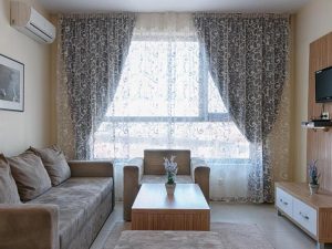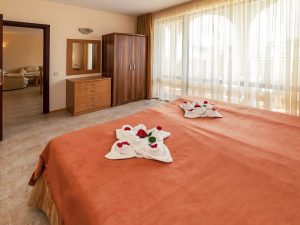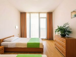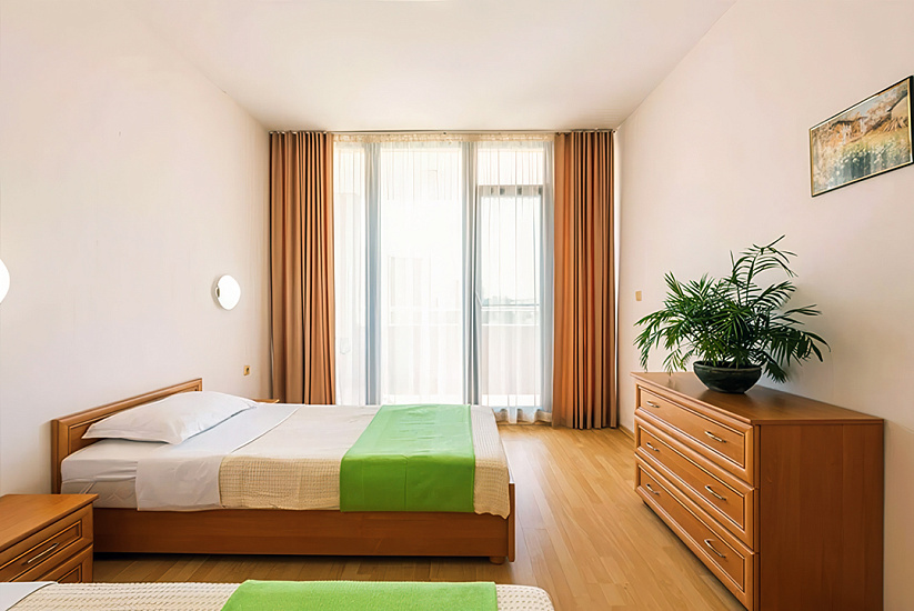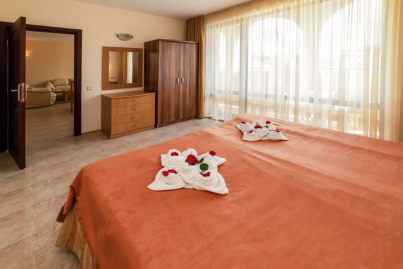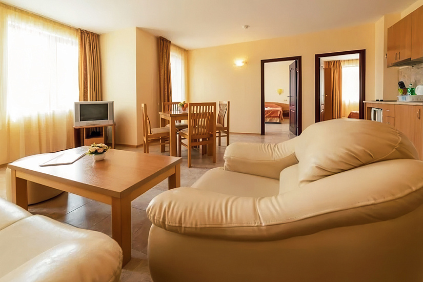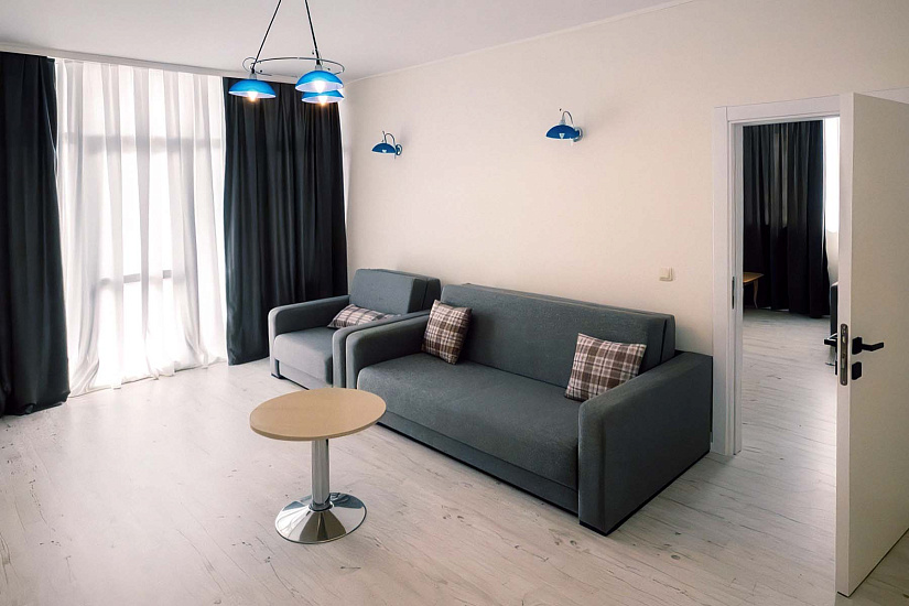 - 1-bedroom Apartment: 2 комнаты: спальня с 1 двуспальной или 2 односпальными кроватями + гостиная с раскладным диваном и кухонным боксом. Макс. размещение: 3 взр.