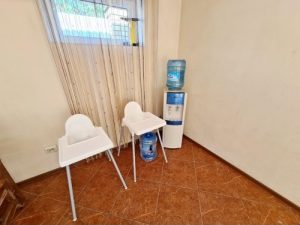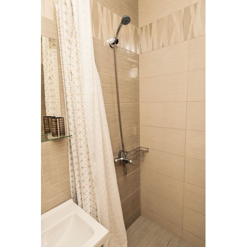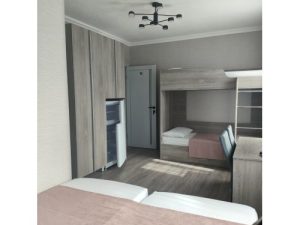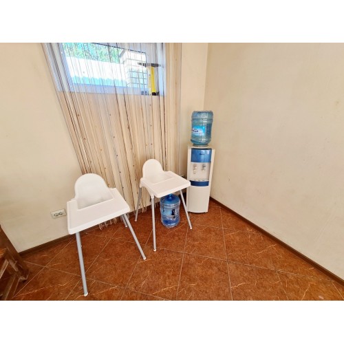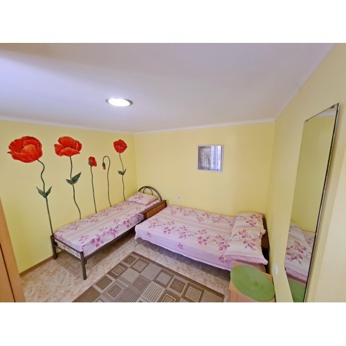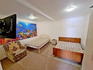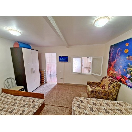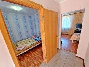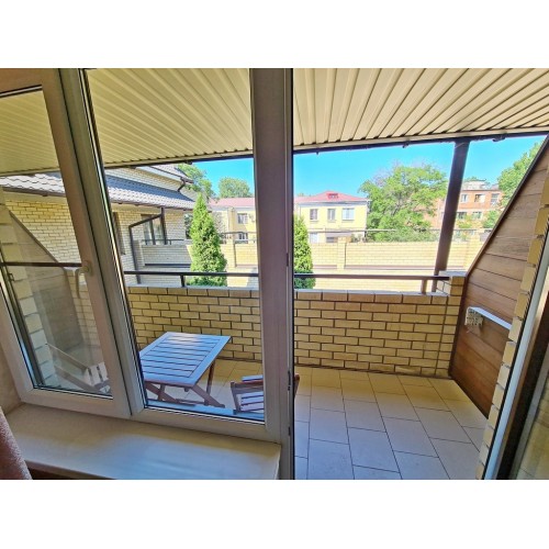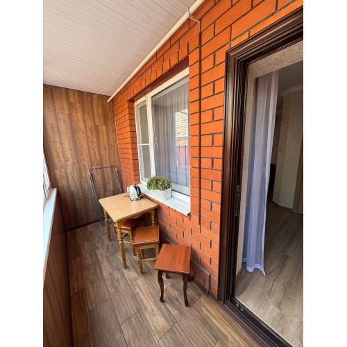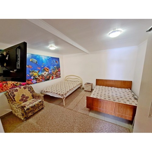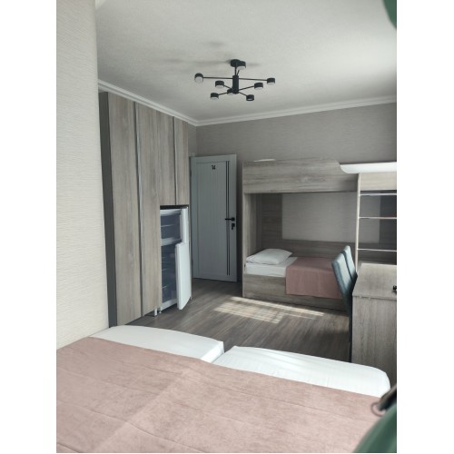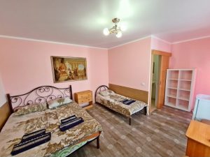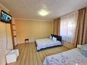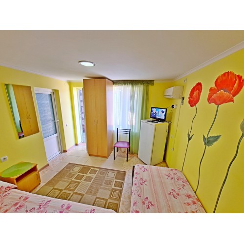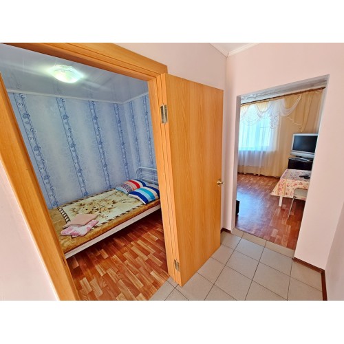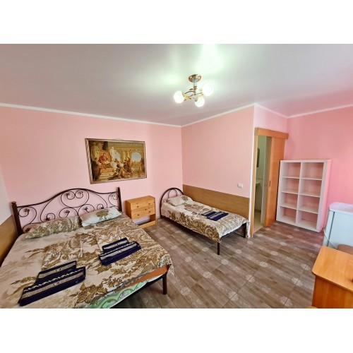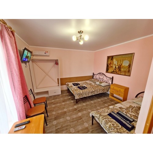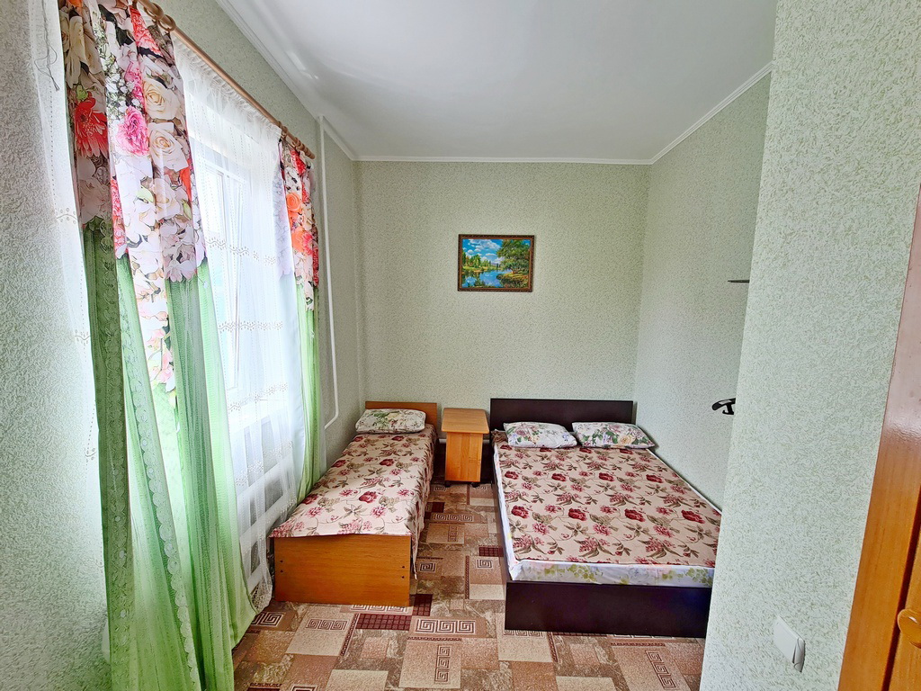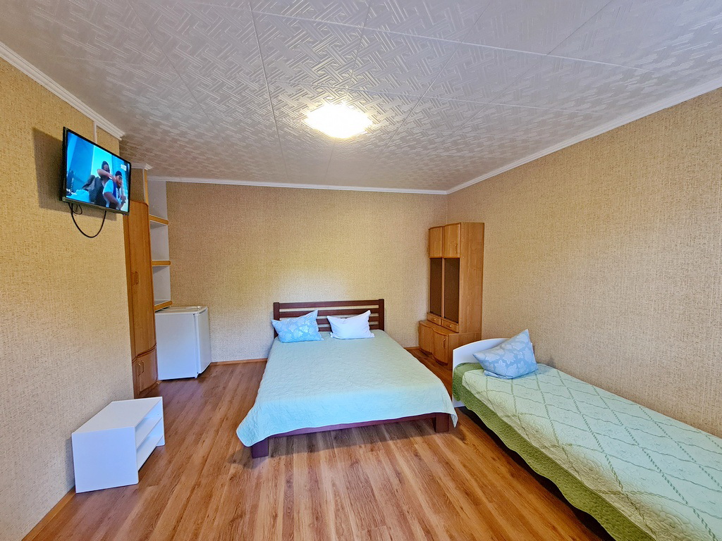 - 4-х (можно как 3-х) местный номер со всеми удобствами на 1 этаже: односпальная и двуспальная кровати, раскладное кресло-кровать (80х200 см), необходимая мебель, сплит-система, телевизор, холодильник, санузел с душевой кабиной, фен. При необходимости предоставляется детская кроватка (матрас, подушка и постельное белье).