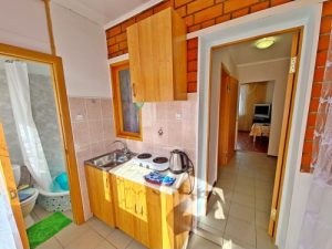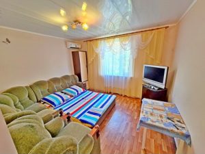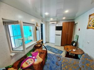 Водник № 9: 13-я дорожка, 50 м от пляжа, двухкомнатный 3-х и 4-х местные номера на 2-м этаже с балконом. В первой комнате: двухместный диван, холодильник, вентилятор, гладильная доска, утюг. Во второй комнате: угловой диван, раскладное кресло, стол, шкаф, кондиционер, телевизор. На кухне необходимая мебель, электроплита, чайник, посуда. Совмещенный санузел: душевая кабина, раковина, зеркало, унитаз. Санузел по площади маленький. На балконе сушилка для белья.