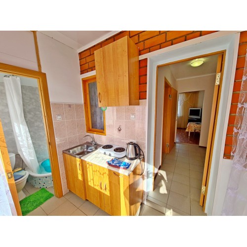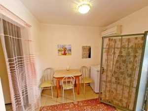 Водник № 65: 22-я дорожка, 150 м от пляжа, 3-х и 4-х местные номера на 1-м этаже. В комнате два двуспальных дивана, стол, стулья, шкаф, холодильник, микроволновка, кондиционер, телевизор, гладильная доска, утюг. На кухне необходимая мебель, стол, стулья, газовая плита, чайник, посуда. Совмещенный санузел: душевая кабинка, раковина, зеркало, водонагреватель, унитаз. Очень маленький по площади санузел и душевая!