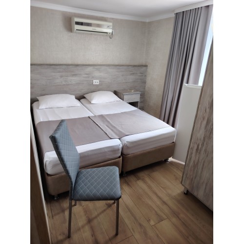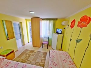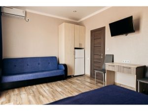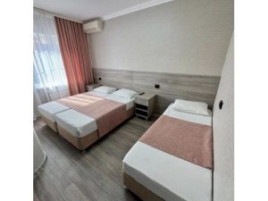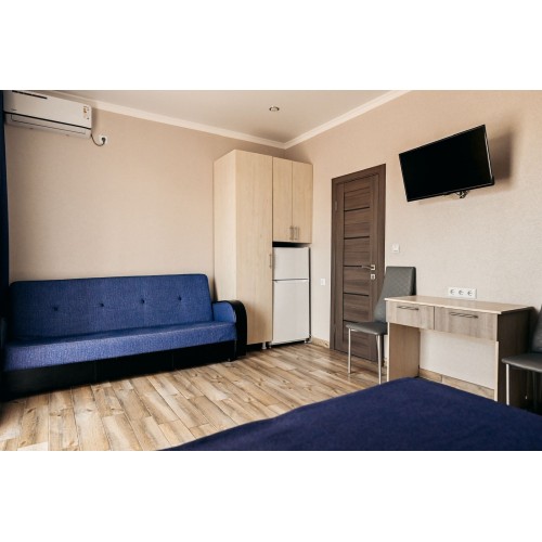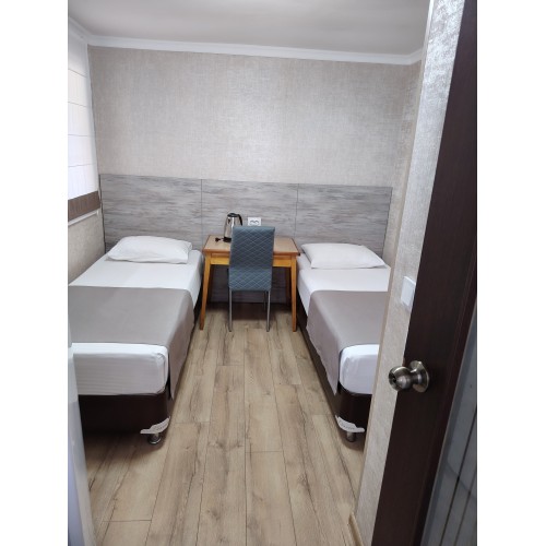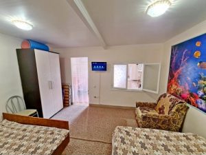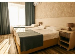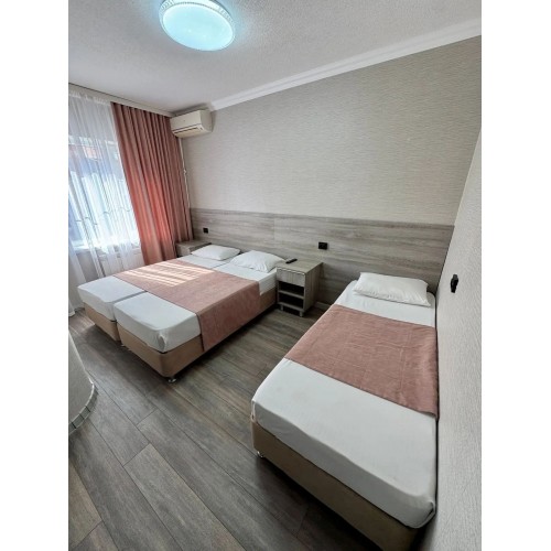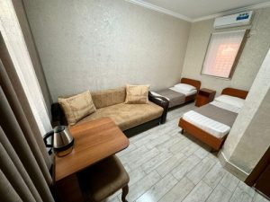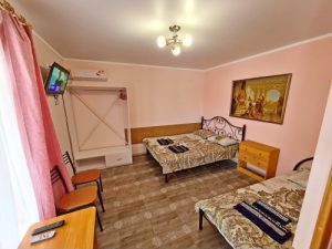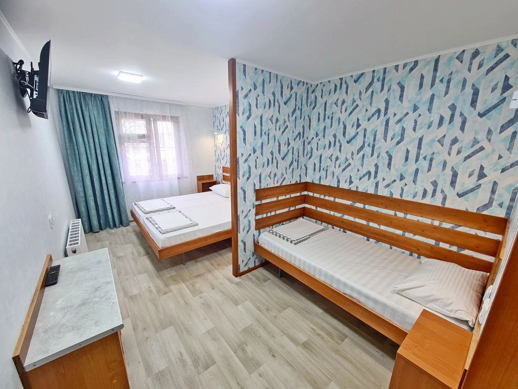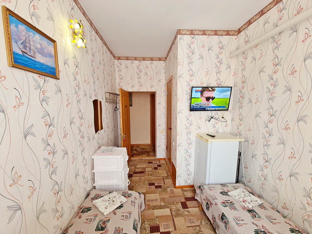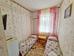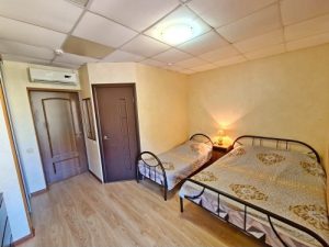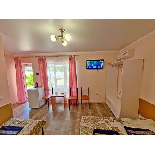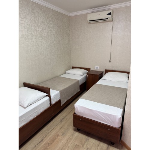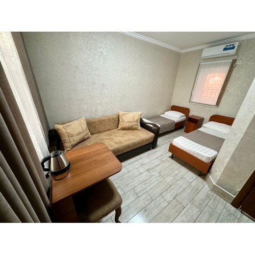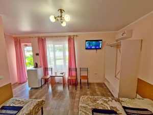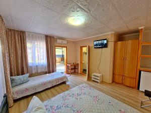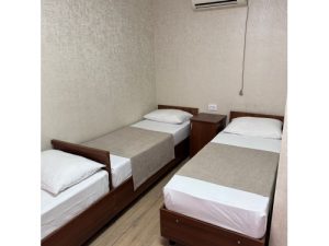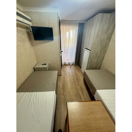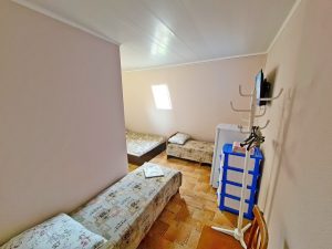 3-х местные номера: на 1 этаже, небольшой по площади номер, две односпальные кровати и диван, необходимая мебель, кондиционер, телевизор, холодильник, чайник, фен, санузел. У входа в номер стол и стулья.