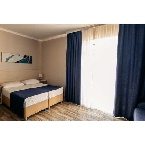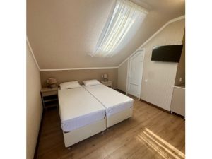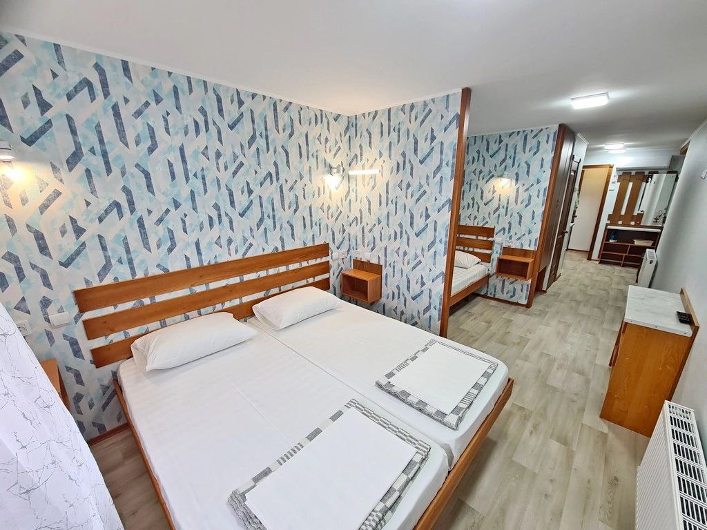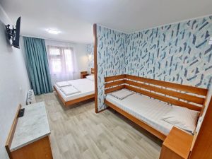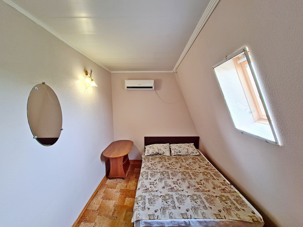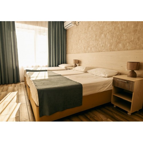 3-х местный номер с балконом на 3 этаже (мансарда) и 3-х местный без балкона на 2 этаже: три односпальных кровати (можно сдвигать), необходимая мебель, кондиционер, телевизор, холодильник, чайник, фен, санузел, душ. Допместо по запросу (детская кроватка).