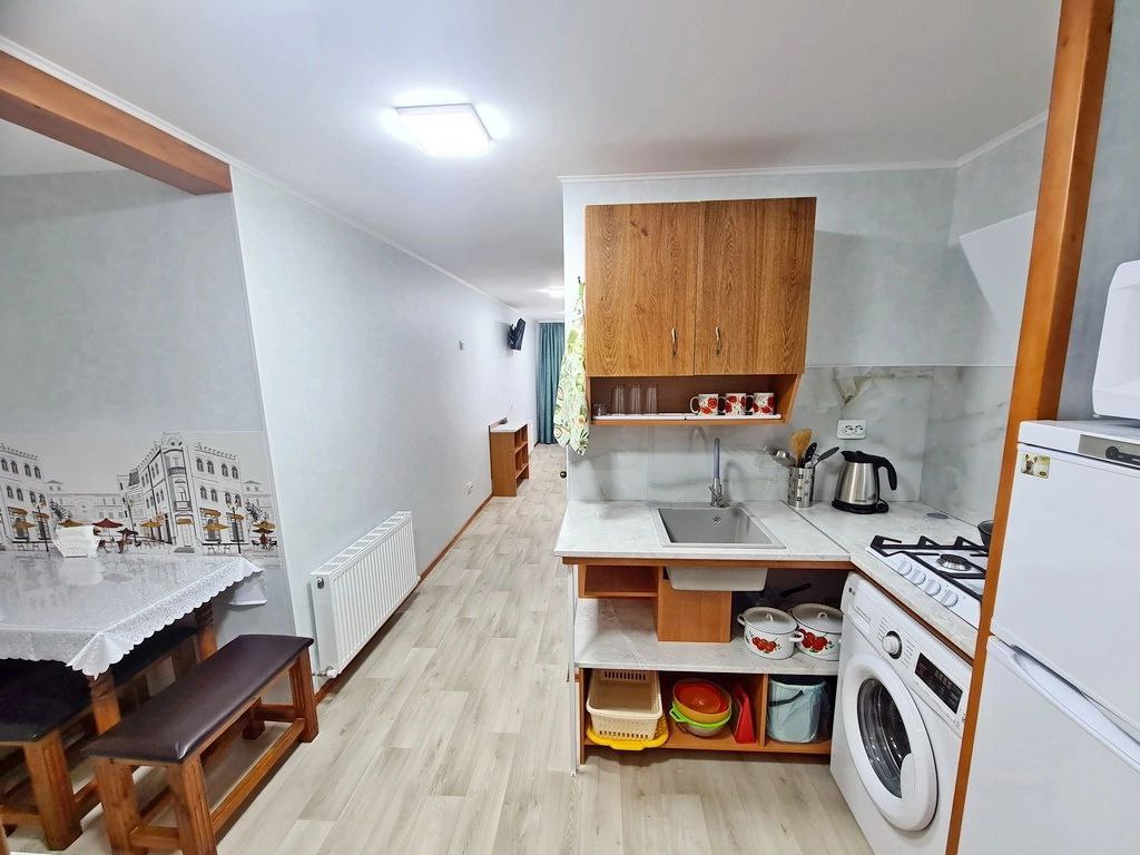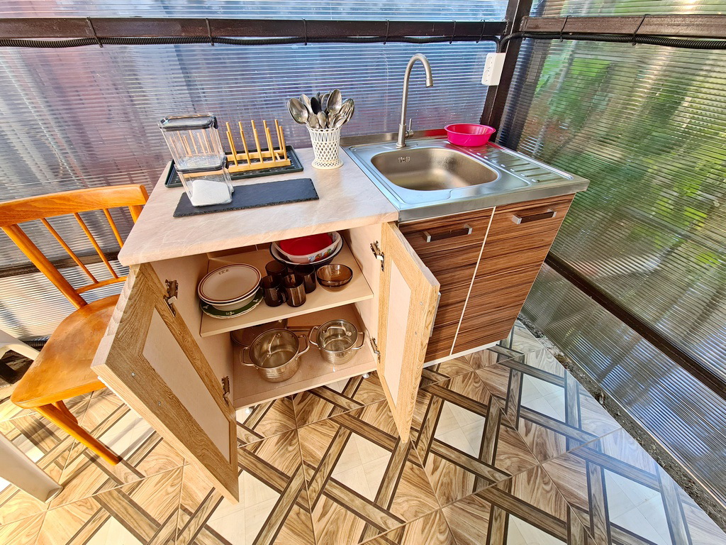 Питание: кухня (газовая плита, микроволновая печь, чайник, набор всей необходимой посуды). Есть мангальная зона. В шаговой доступности множество кафе и ресторанов.