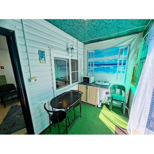 Двухкомнатный 4-х местный номер: на 2 этаже, наружная лестница, две комнаты, межкомнатная дверь, в каждом номере по 2 раздельные кровати (можно сдвинуть), необходимая мебель, холодильник, в каждой комнате кондиционер и телевизор, общая терраса, там сушилка для белья. Санузел, фен.