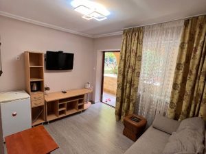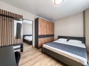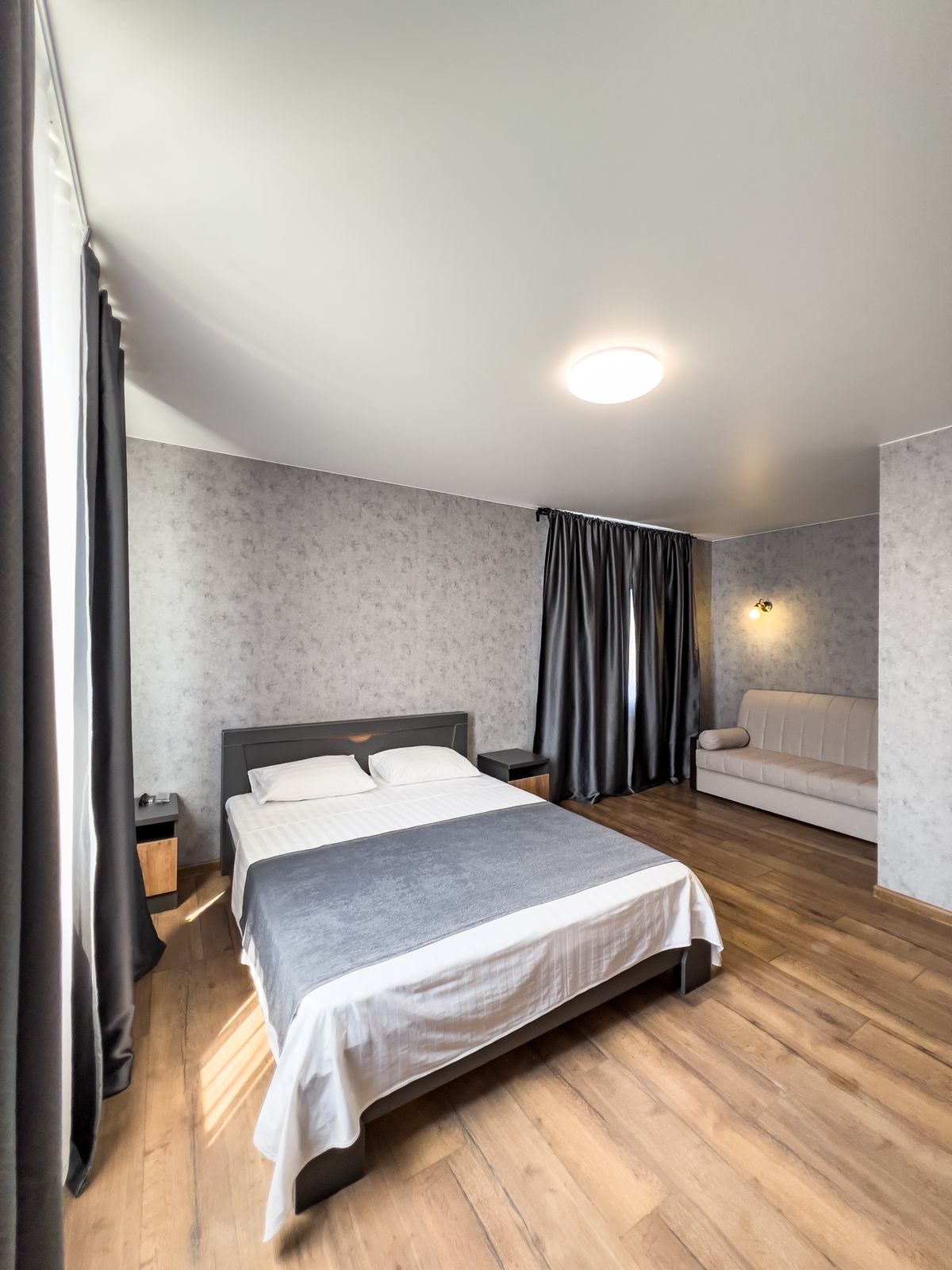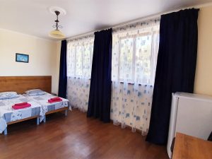 • Двухкомнатные 4-5-ти местные номера (1-й и 2-й корпус): санузел в номере, телевизор в каждой комнате, холодильник, сплит-система, двуспальные или односпальные кровати, возможен раскладной диван, шкаф, тумбочки, журнальный столик, зеркало, межкомнатная дверь или арка. Допместо под запрос. Балкона нет