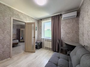• 2-х комнатные 4-х местные номера со всеми удобствами (на 1 этаже корпуса): две спальни, в одной большой раскладной диван или двуспальная кровать, во второй двуспальная кровать или две раздельные кровати, в каждой комнате телевизор, кондиционер, холодильник, один санузел, полотенца. Возможность установки допместа — под запрос.