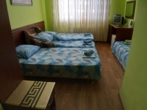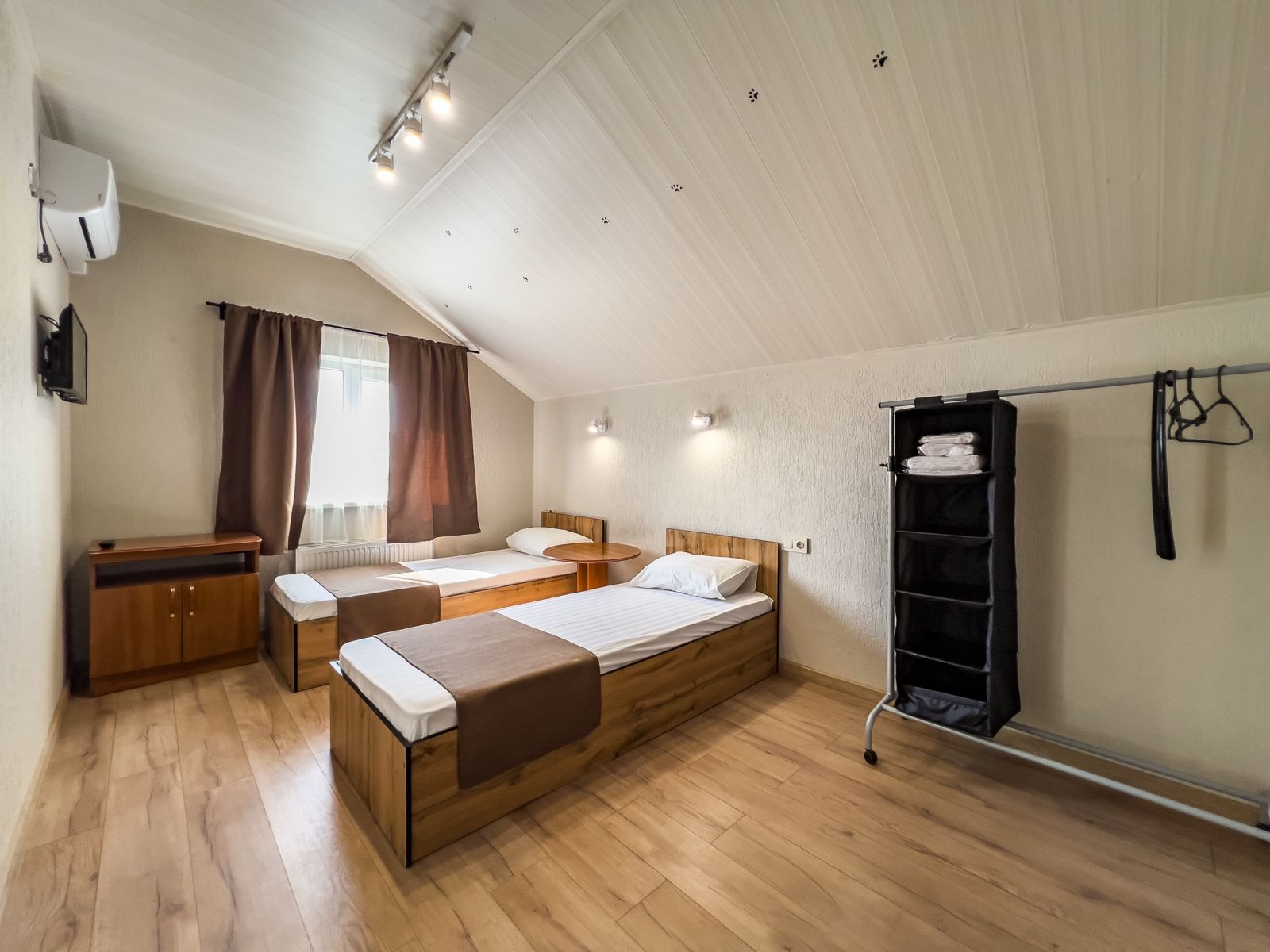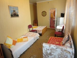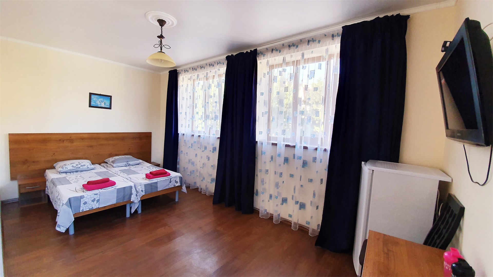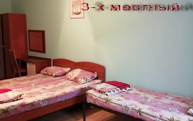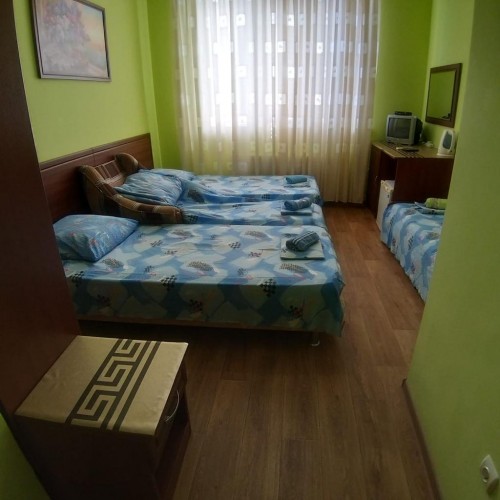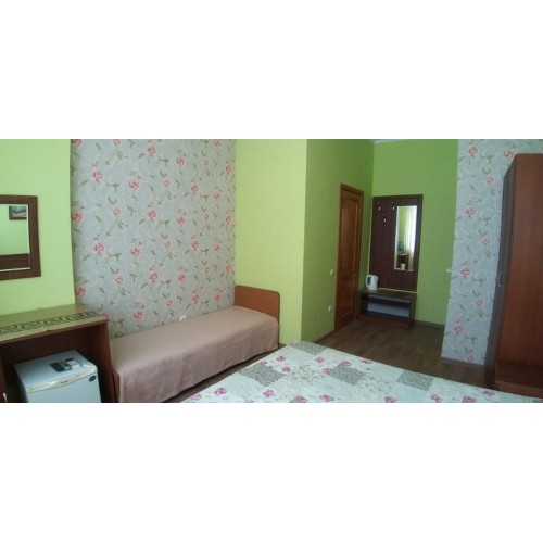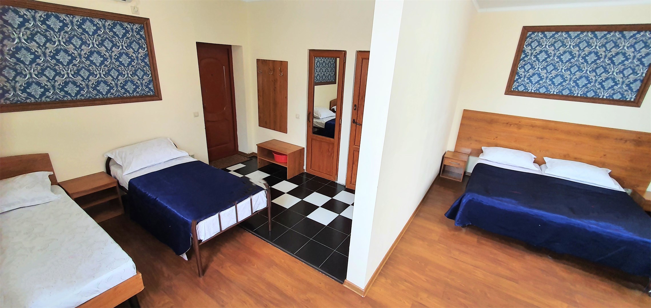 3-х-4-х местный номер со всеми удобствами: односпальные и двуспальная кровати, раскладной диван-кровать или раскладное кресло-кровать, шкаф, стулья, прикроватные тумбочки, стол, вешалка, зеркало, кондиционер, телевизор, санузел. Есть номер со своей кухней (под запрос), холодильник. Возможно допместо (кресло-кровать или раскладной диван). Есть возможность запросить семейные номера из двух комнат, отдельная терраса.