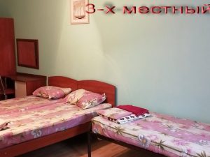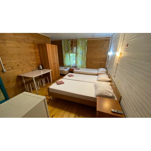 • 3-х местные номера (во всех корпусах): санузел в номере, в каждом номере телевизор, холодильник, сплит-система, двуспальная кровать, односпальные кровати, кресло-кровать или раскладной диван, шкаф, тумбочки, журнальный столик, зеркало. Допместо не предусмотрено. Балкона нет