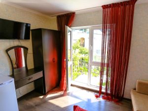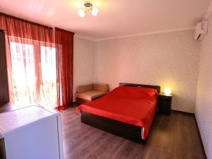 - 2-х местный «Стандарт» с одной кроватью: 2 места, 1 комната, душ и туалет в номере, кондиционер, телевизор, холодильник, балкон. Номер находится на 2-м этаже правого домика. Из номера боковой вид на море. Номер абсолютно новый, в нем сделан качественный ремонт с оборудованием современного санузла, а также выполнен индивидуальный дизайн номера с подсветкой, балкон-терраса номера имеет вид на море.