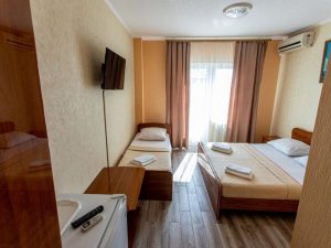- 2/3-х местные номера стандарт: 2/3 спальных места, 15 кв. м, холодильник, сплит/кондиционер, ТВ, душ/туалет в номере, набор посуды, полотенца